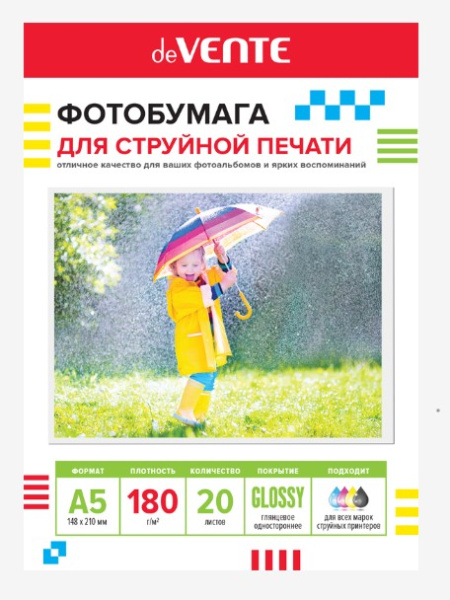 Фотобумага для струйной печати, deVENTE, А5, 20 л, 180 г;м2, глянцевая, односторонняя, 2042402