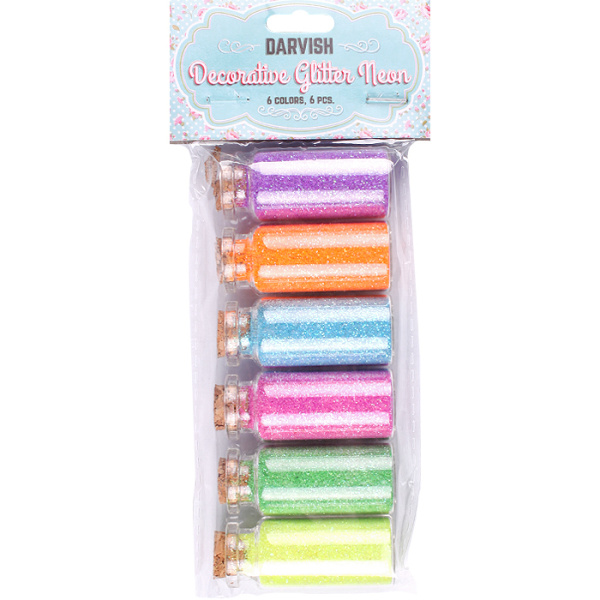 —Декоративные блёстки Darvish 'Неон' 6 цв, 6 шт, стеклян. колбы, европодвес, DV-11777