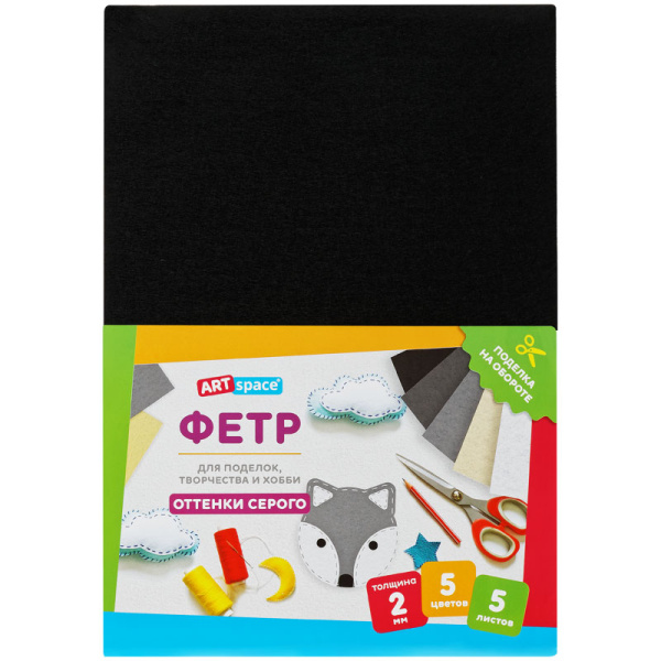 —Фетр ArtSpace, А4, 5 листов, 5 цветов, 2 мм, оттенки серого, Фц5_38062
