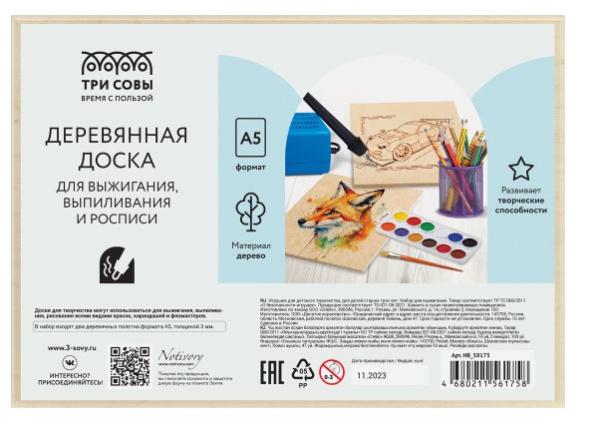 —Деревянная доска для выжигания, выпиливания, росписи по дереву ТРИ СОВЫ, 2 шт, А5, HB_58175