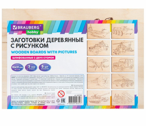 —Заготовки деревянные для выжигания 'Военная техника', 5 шт., 10 рисунков, 15х21 см, BRAUBERG HOBBY